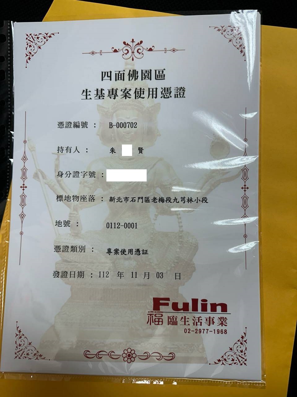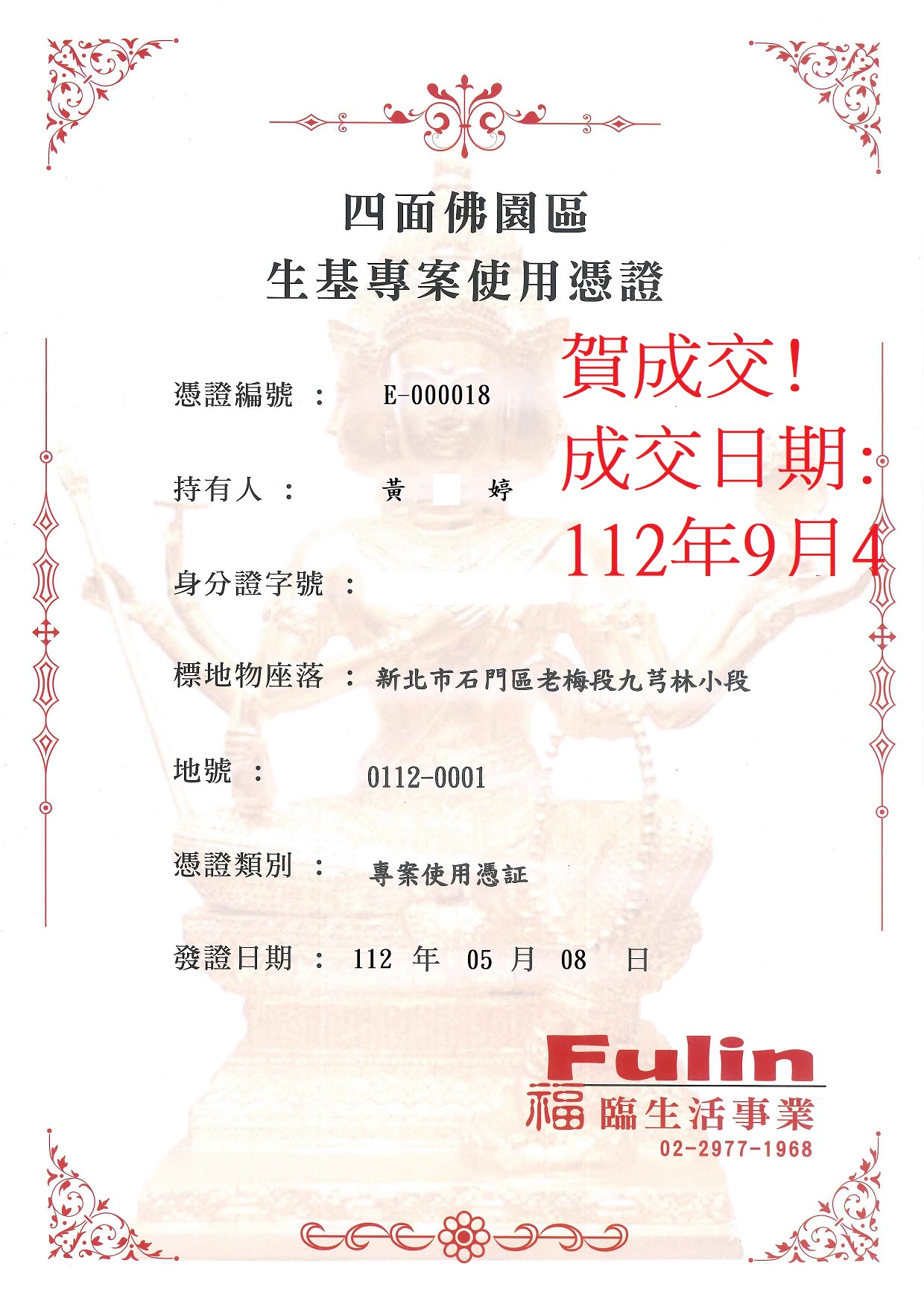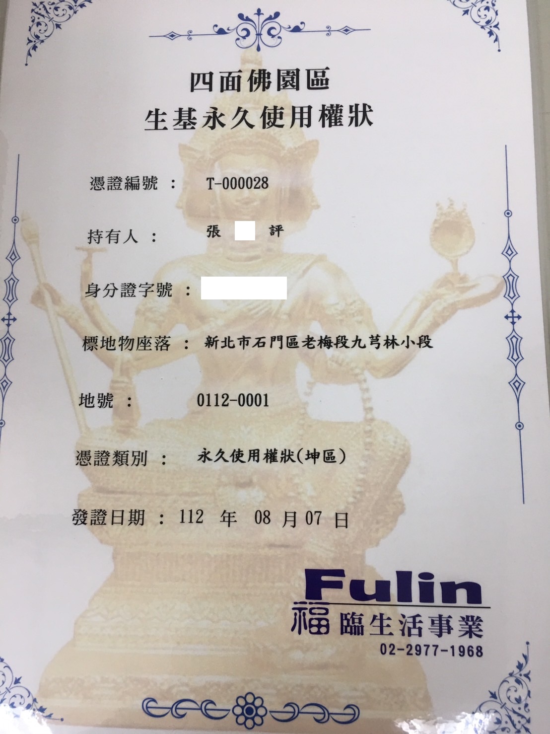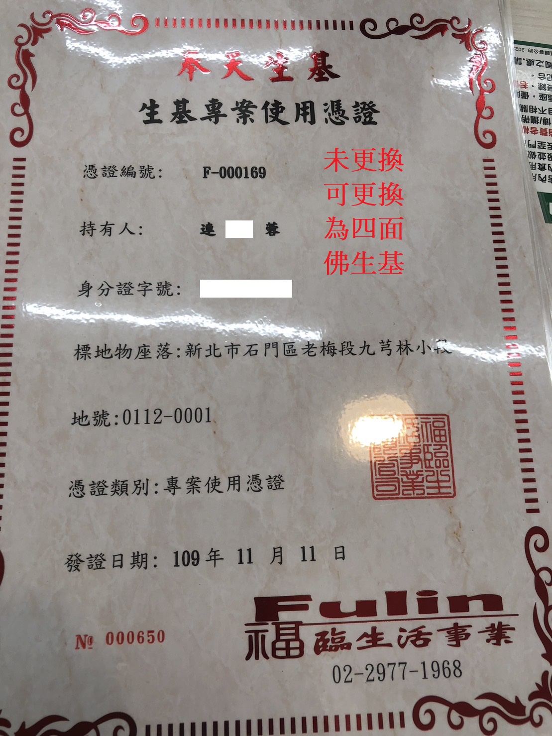 四面彿永久使用權狀