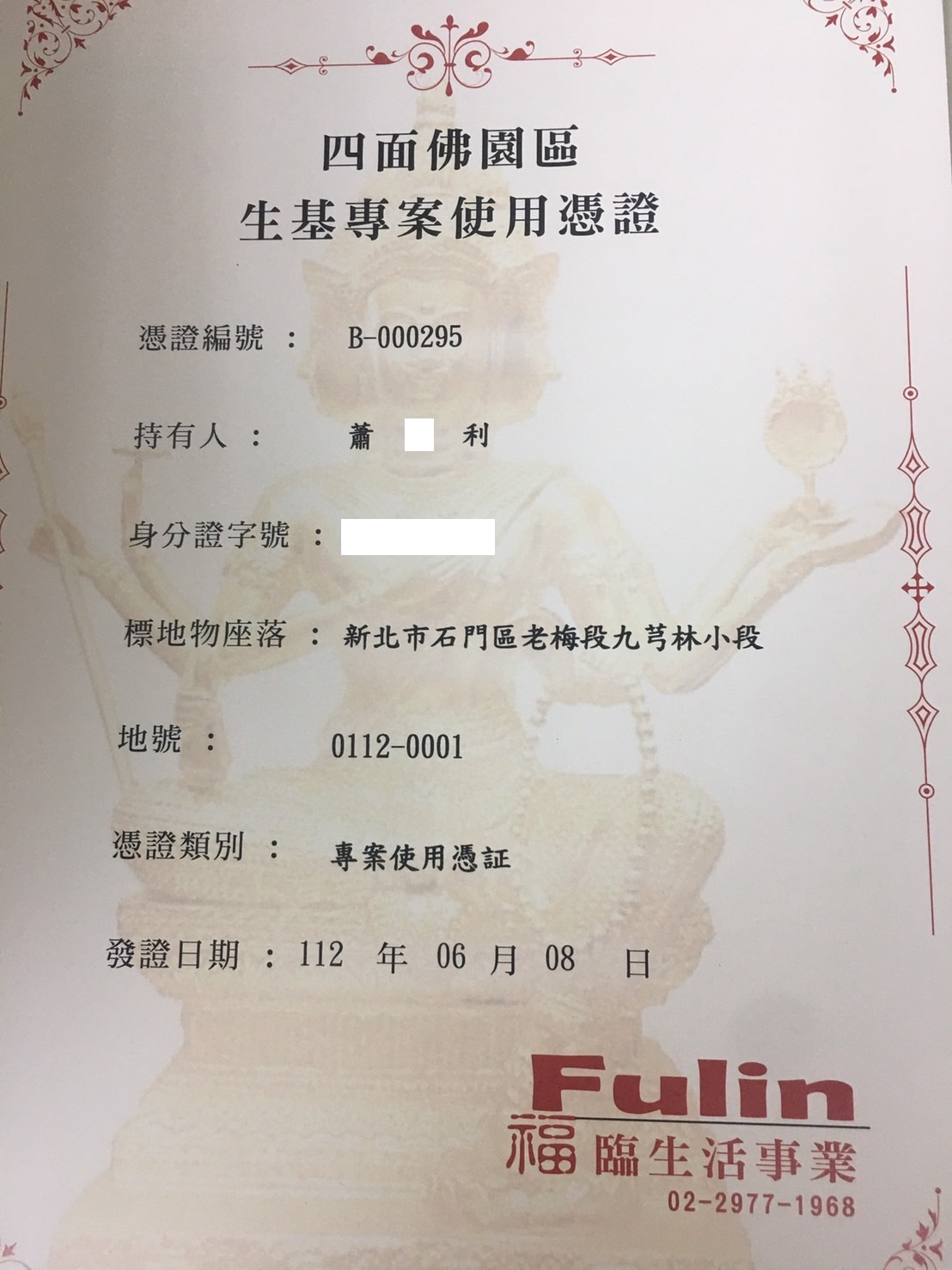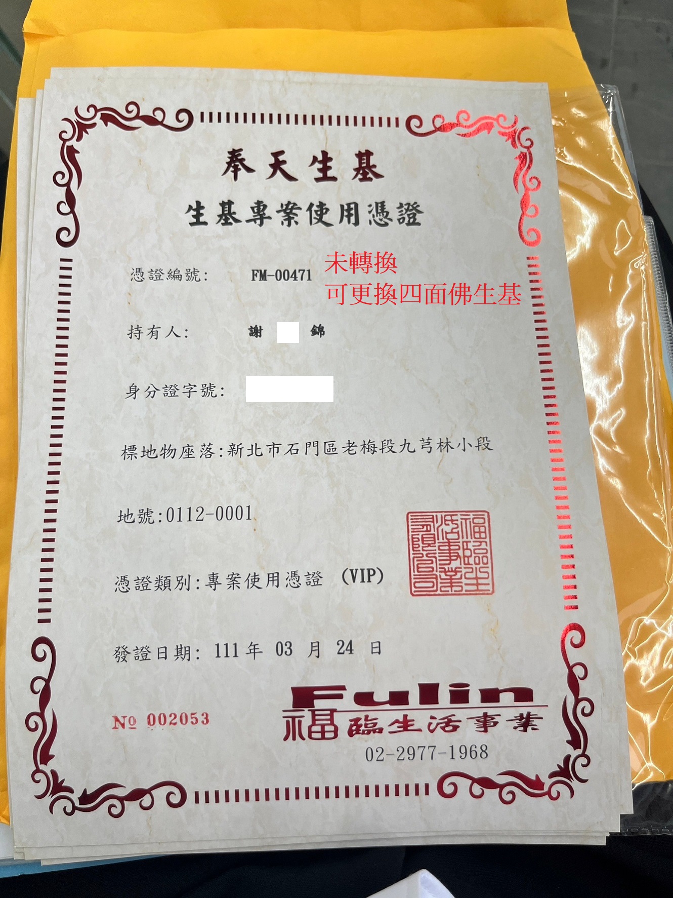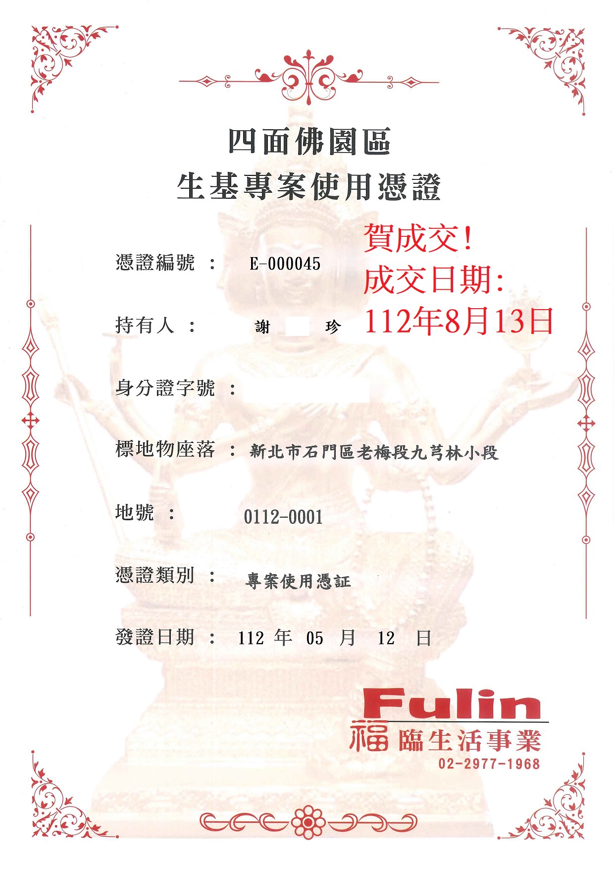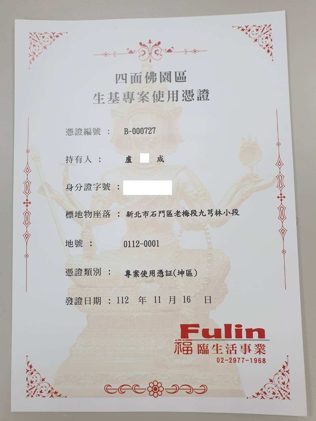 四面彿永久使用權狀