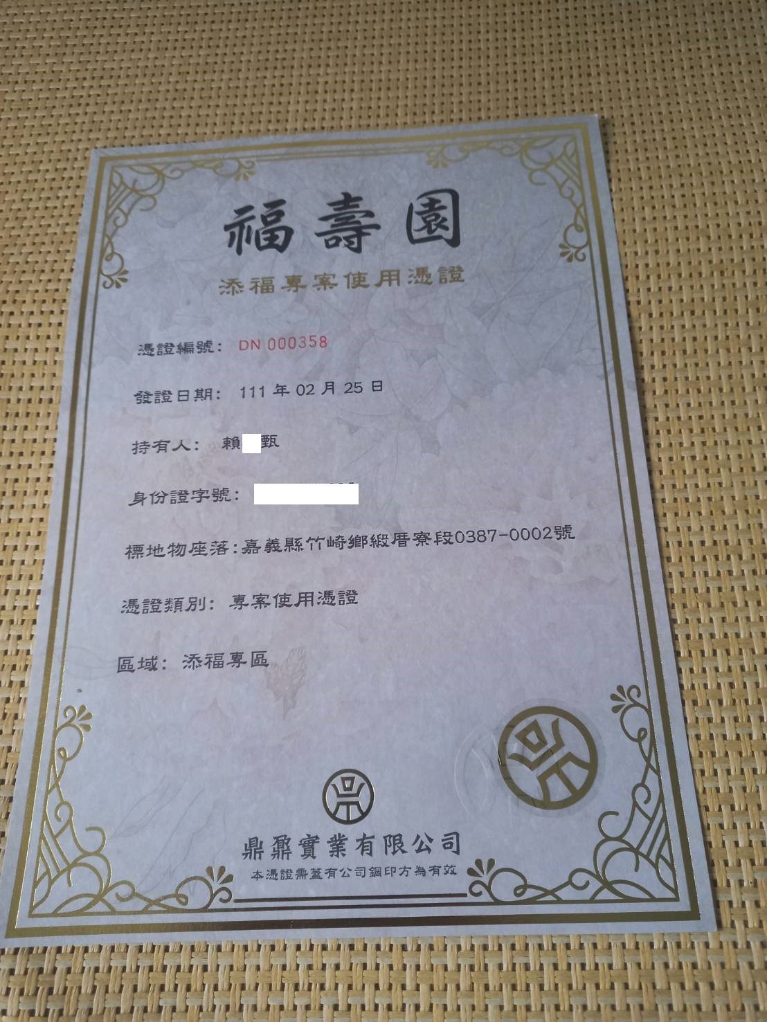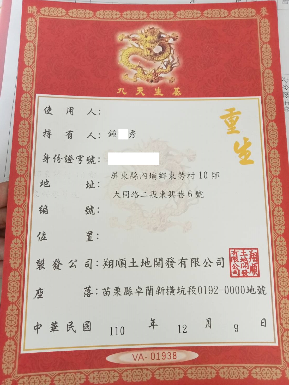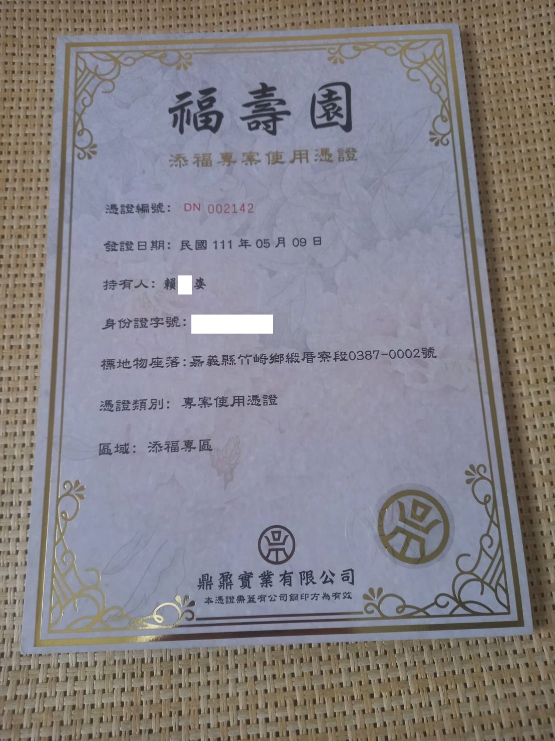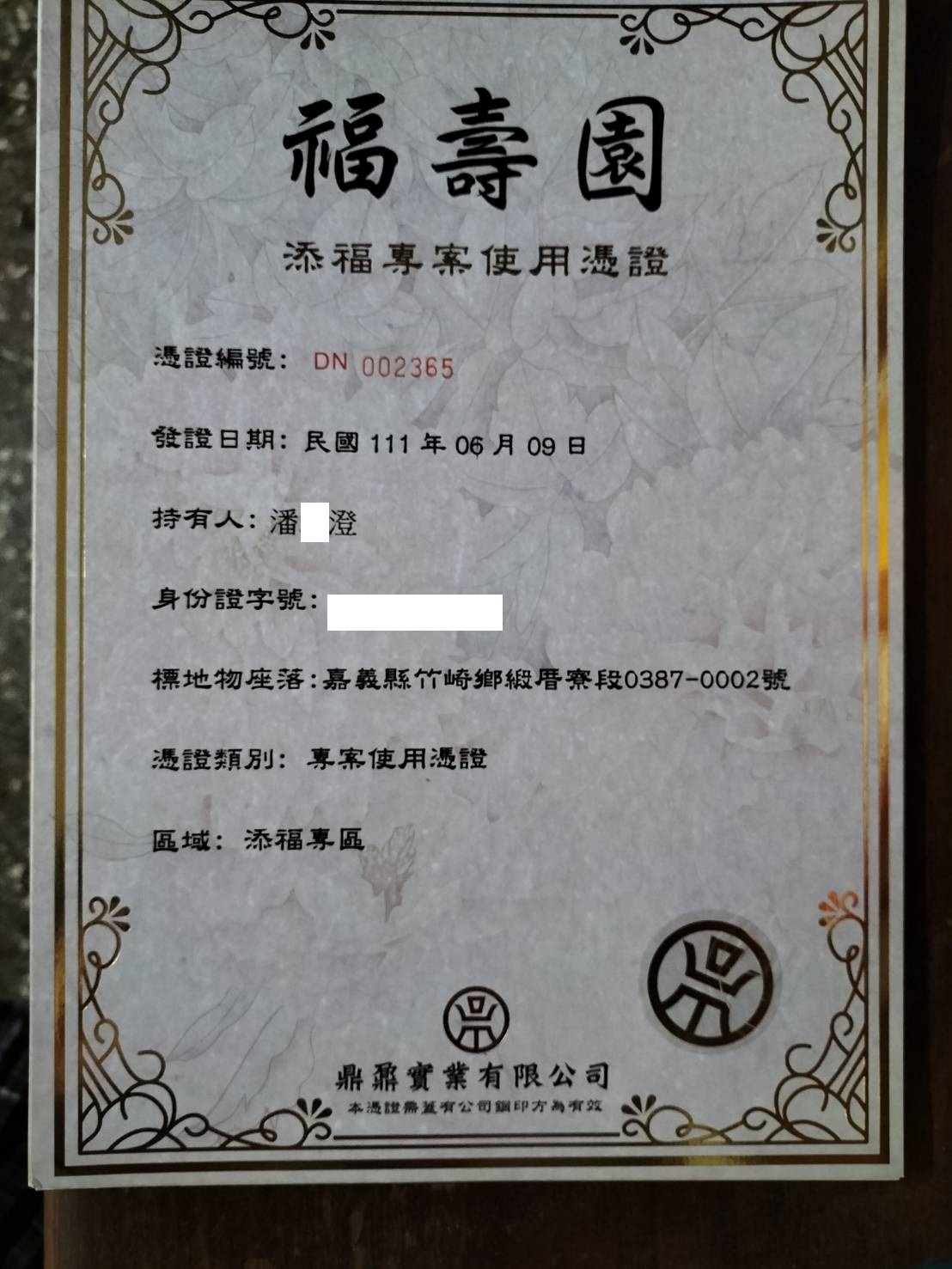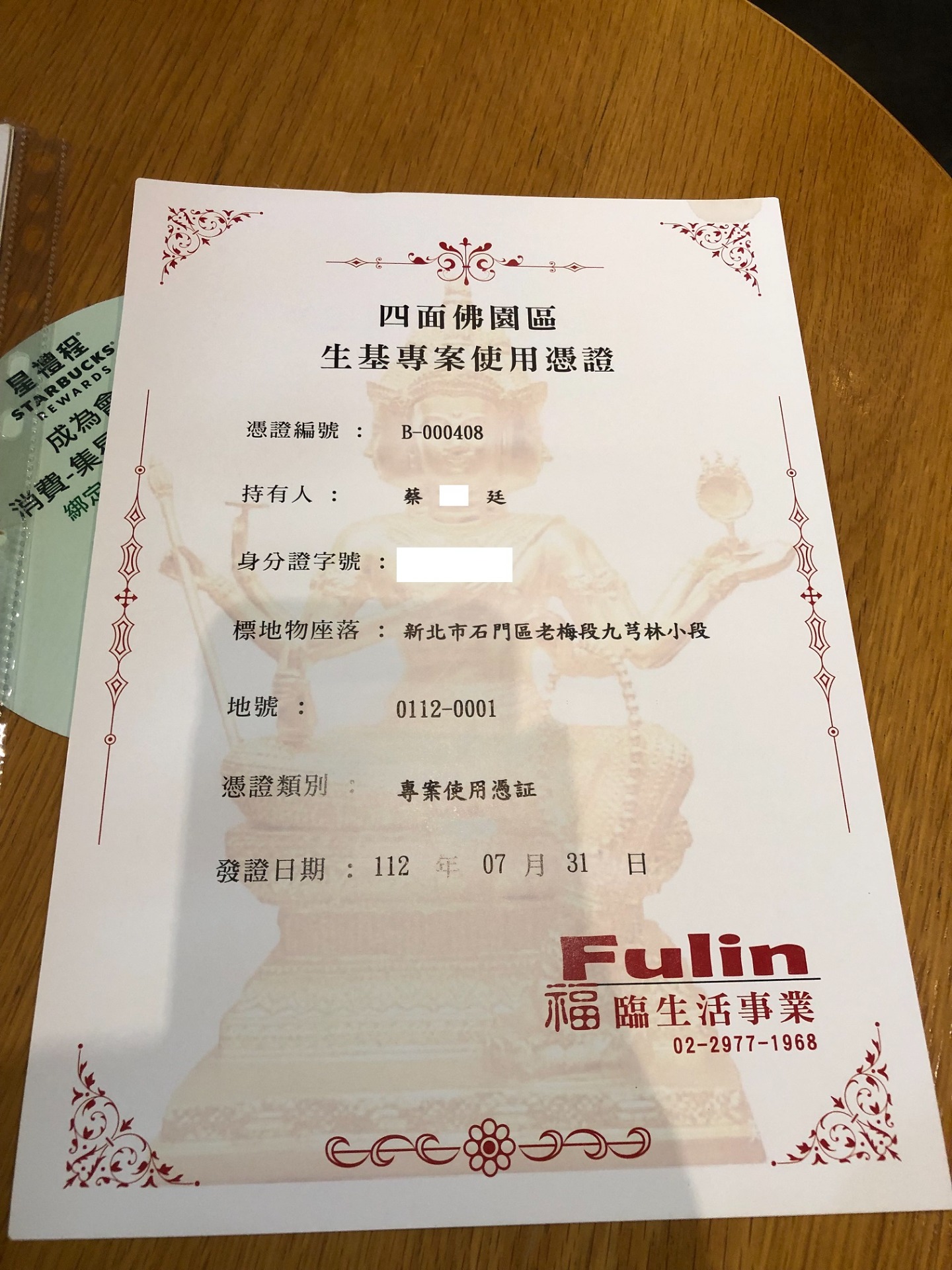 四面彿永久使用權狀