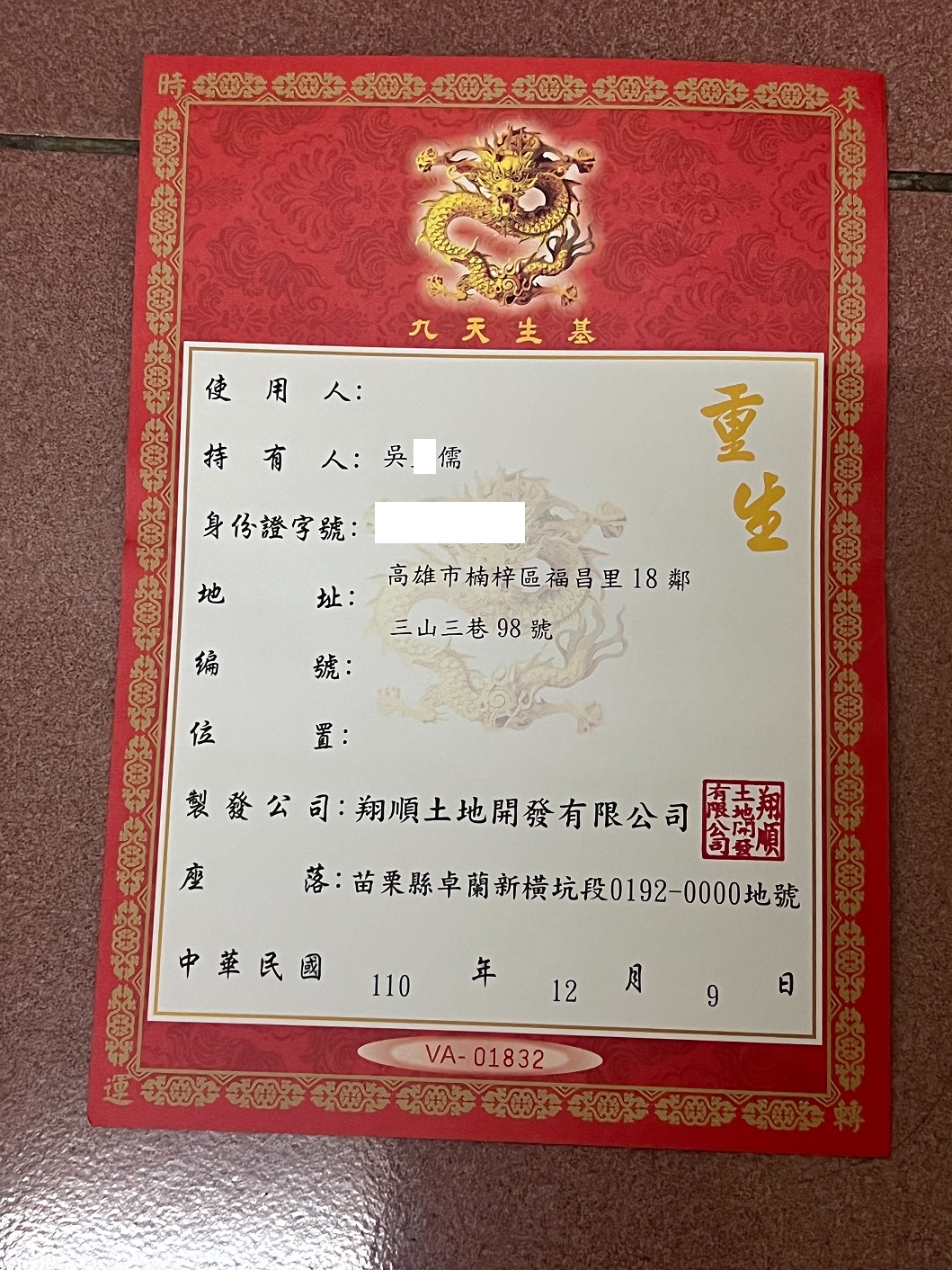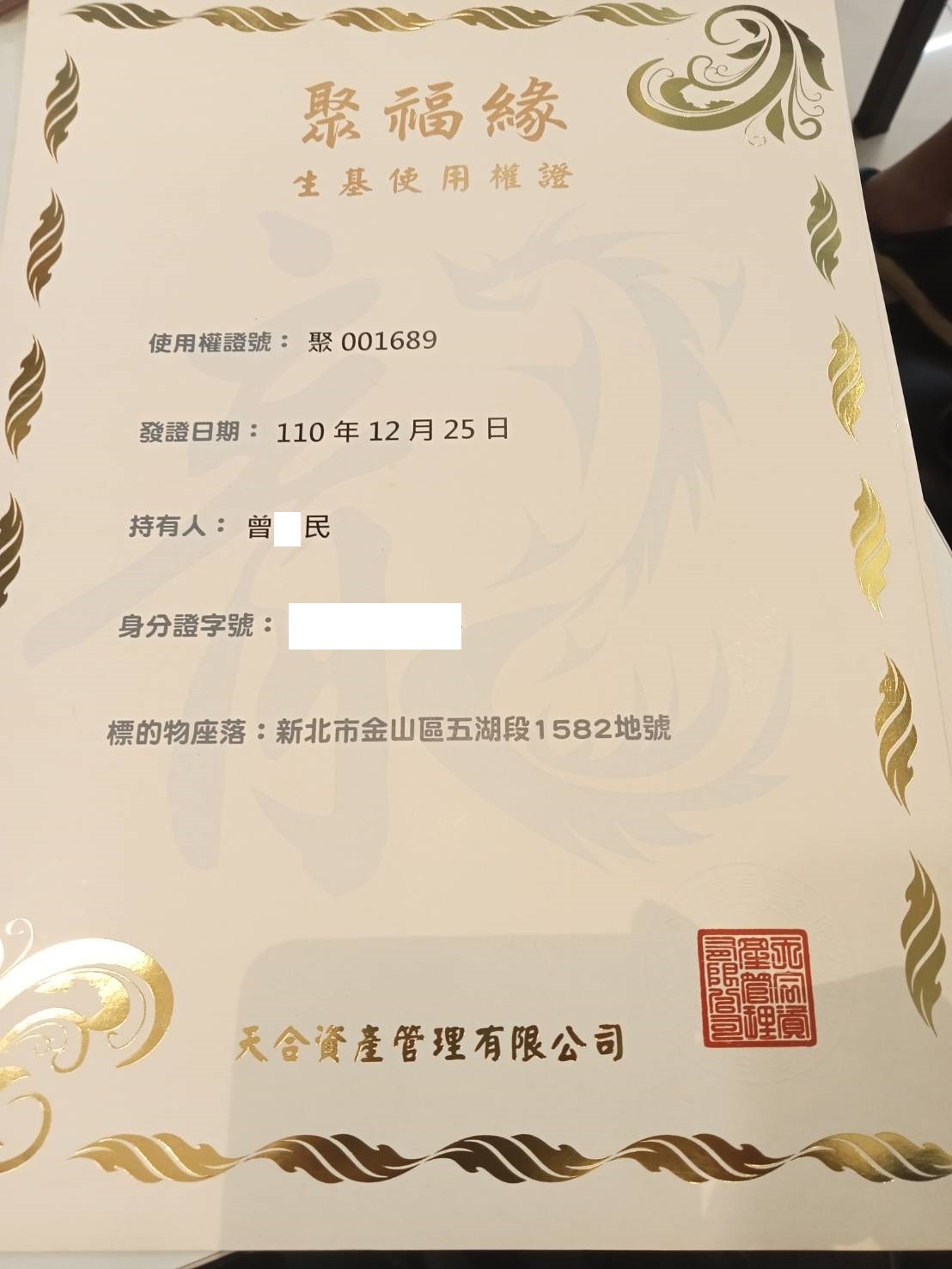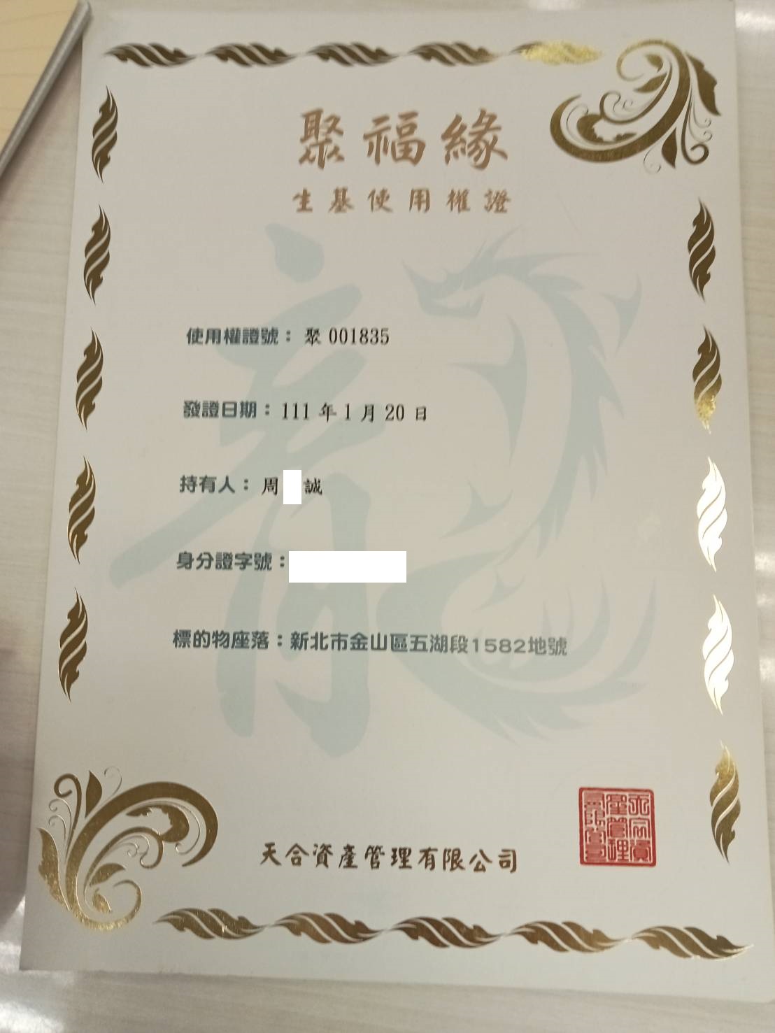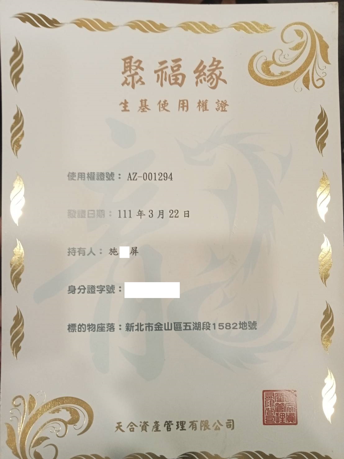 四面彿永久使用權狀